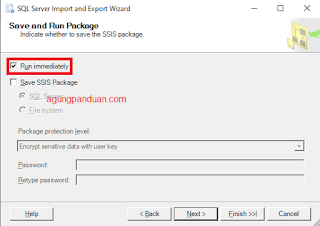 klik tombol Next, halaman Simpan dan Jalankan Paket dari SQL Server Import and